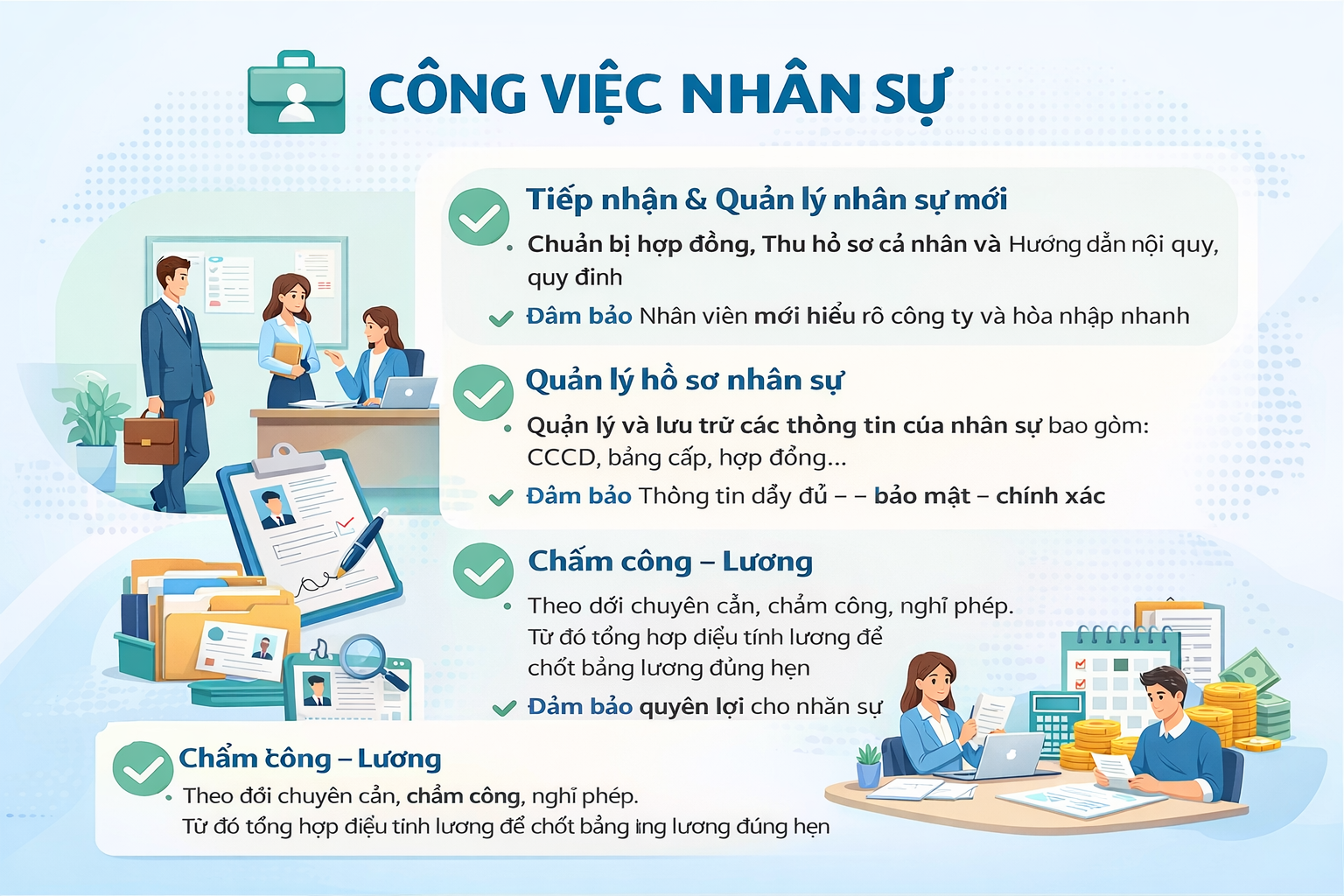 - Tiếp nhận & quản lý nhân sự mới: Chuẩn bị hợp đồng, Thu hồ sơ cá nhân và Hướng dẫn nội quy, quy định