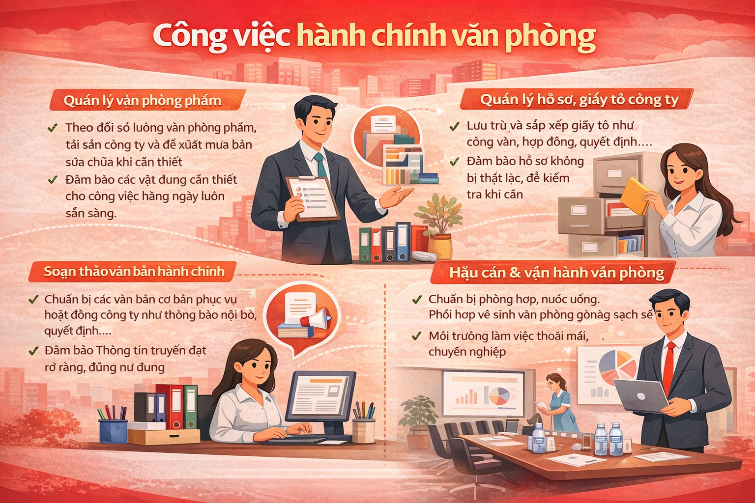 - Hành chính: quản lý văn phòng, giấy tờ, hậu cần, tài sản