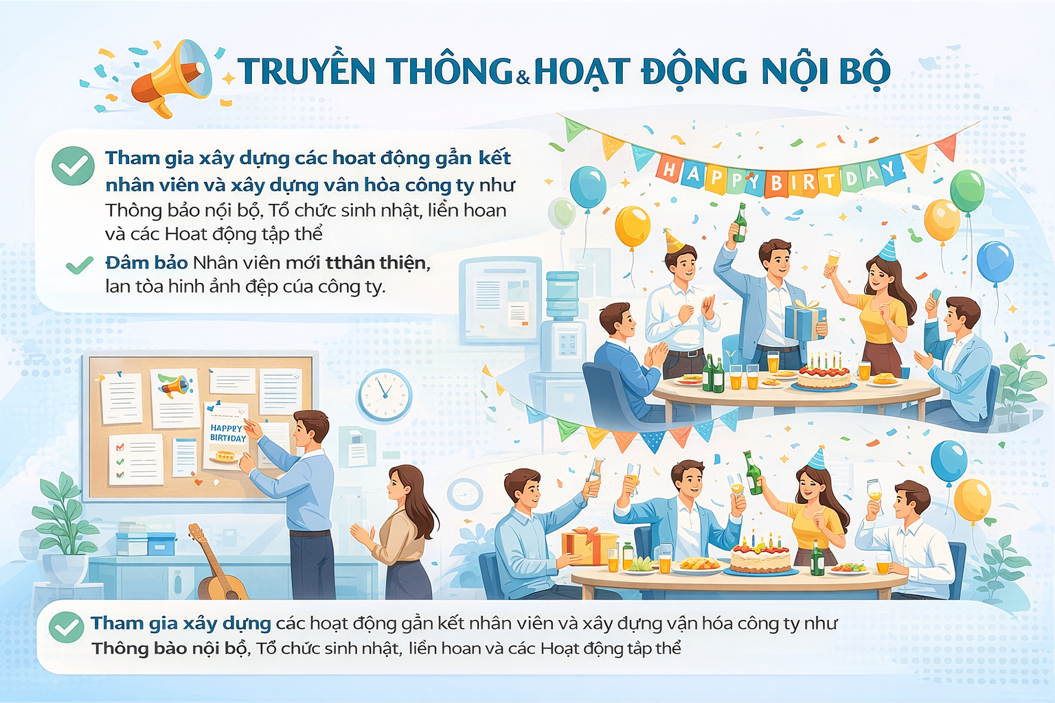 - Tham gia xây dựng các hoạt động gắn kết nhân viên và xây dựng văn hóa công ty như Thông báo nội bộ, Tổ chức sinh nhật, liên hoan và các Hoạt động tập thể