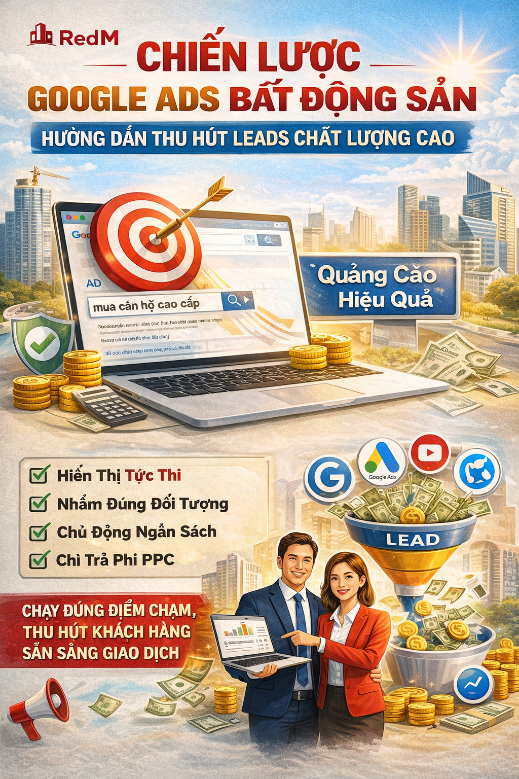 Thị trường bất động sản cạnh tranh ngày càng khốc liệt, và Google Ads đang trở thành “vũ khí” giúp các môi giới, chủ dự án tiếp cận khách hàng đúng nhu cầu, đúng thời điểm. Nhưng để quảng cáo thật sự hiệu quả, bạn cần một chiến lược rõ ràng thay vì “đốt tiền” theo cảm tính. Cùng tìm hiểu chiến lược Google Ads Bất Động Sản dưới đây nhé.