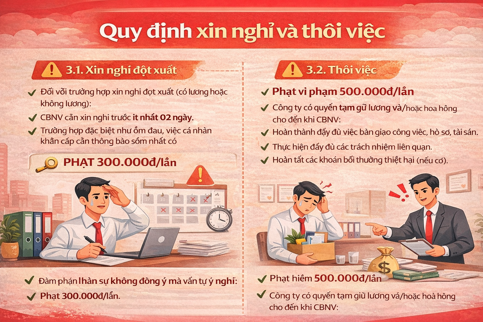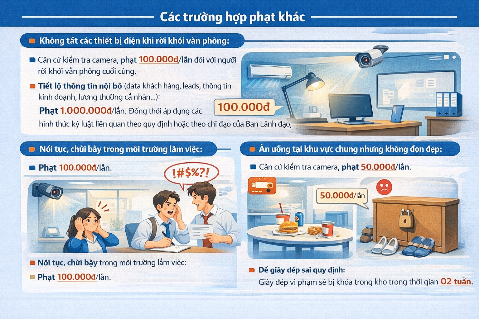 - Đồng thời áp dụng các hình thức kỷ luật liên quan theo quy định hoặc theo chỉ đạo của Ban Lãnh đạo, tùy mức độ vi phạm.