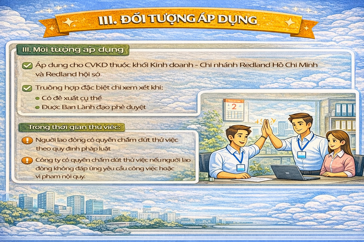 - Áp dụng cho CVKD thuộc khối Kinh doanh- Chi nhánh Redland Hồ Chí Minh và Redland hội sở