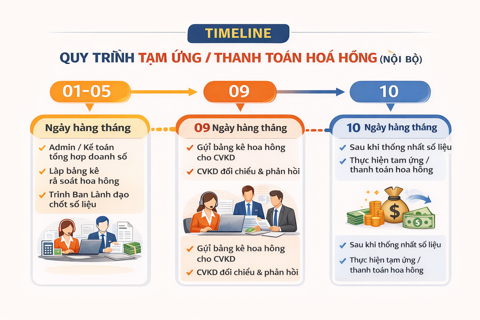 Nhằm đảm bảo việc thanh toán hoa hồng minh bạch – đúng hạn – đúng số liệu, Công ty ban hành quy trình tạm ứng/thanh toán hoa hồng như sau: