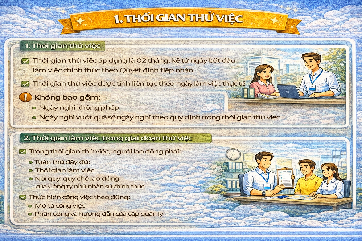 Thời gian thử việc áp dụng là 02 tháng, kể từ ngày bắt đầu làm việc chính thức theo Quyết định tiếp nhận
