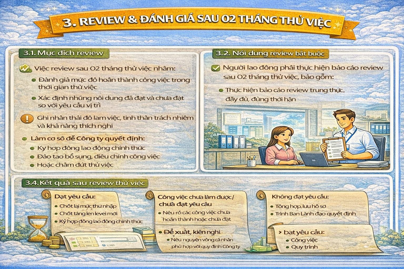 Người lao động phải thực hiện báo cáo review sau 02 tháng thử việc, bao gồm các nội dung sau: